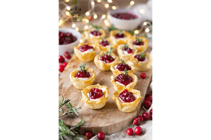 - Method: Place a cube of brie in the center of each pastry cup. Add a small dollop (about 1 tsp) of cranberry sauce on top of the brie. Sprinkle with a pinch of chopped rosemary for an herby touch.